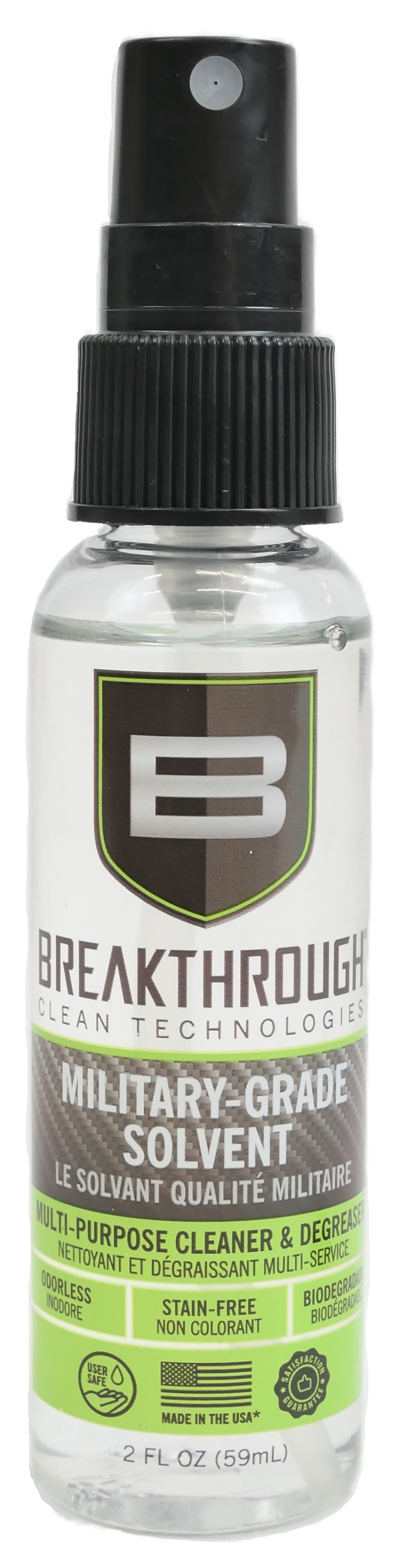 Solvant de qualité militaire en bouteille spray de 59 ml pour nettoyer l'armement. Le produit est inodore, non colorant, élimine totalement l’encrassement, et s'évapore complètement, ne laissant aucun résidu. Les produits de nettoyage Breakthrough® Clean sont à la pointe de la technologie et permettent un nettoyage plus rapide et plus sûr de vos armes à feu. Il élimine plus de contaminants que la plupart des produits sur le marché, offrant des performances optimales, la sécurité et une facilité d'utilisation.
